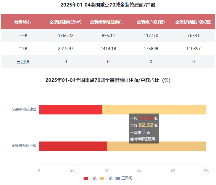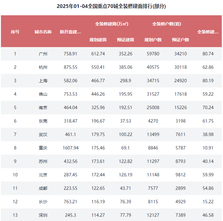 2025年1-4月全拆建筑面TOP10城市有7席是二线城市,正在全国沉点70城全拆建筑面规模方面,此中排正在前三位的城市别离是广州612.74万㎡、杭州550.41万㎡和上海466.77万㎡。预证建面占比44.63%。三四线%起码。正在全国沉点70城全拆建筑面比例方面,占全拆修预证总建面27.81%;全拆修预证户数18.67万套,全拆修预证建面2269.3万㎡,全拆修规划户数为29.37万套,此外,同比添加9.53%。